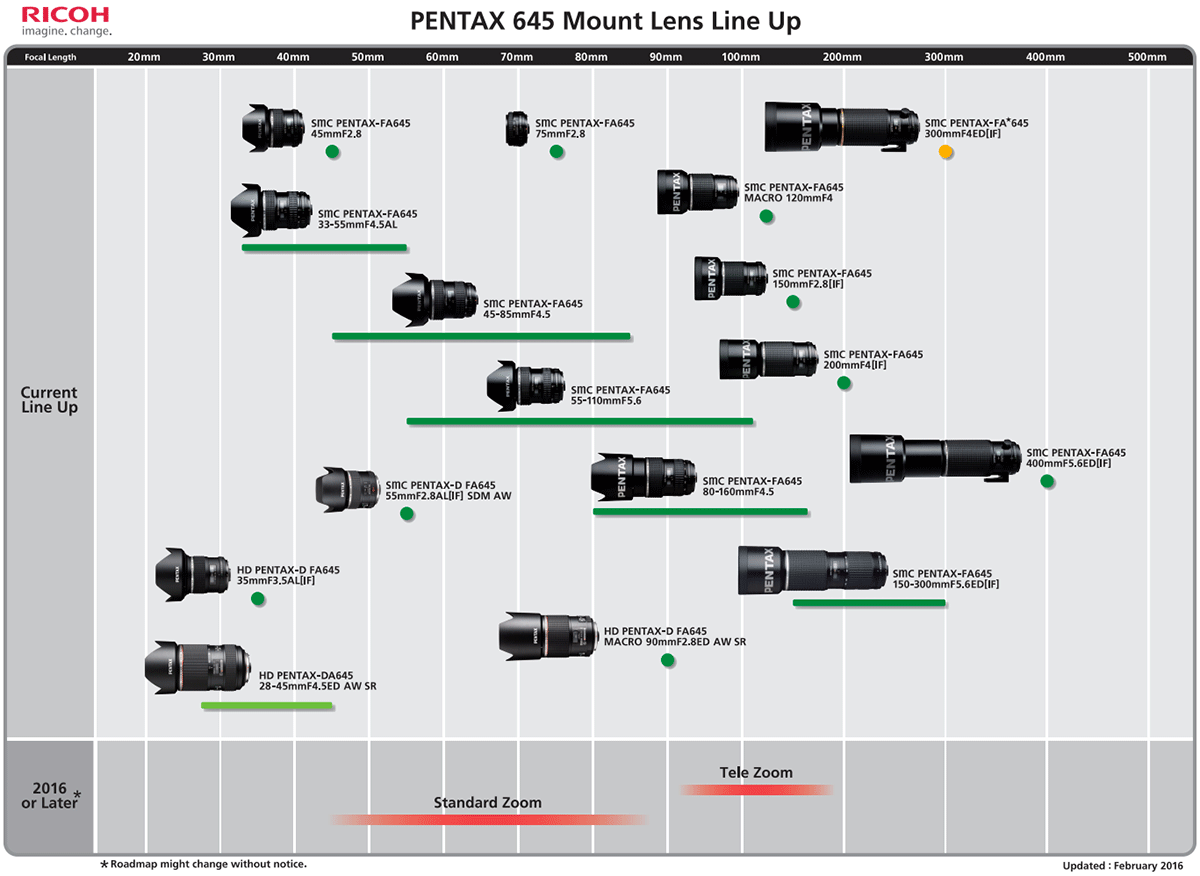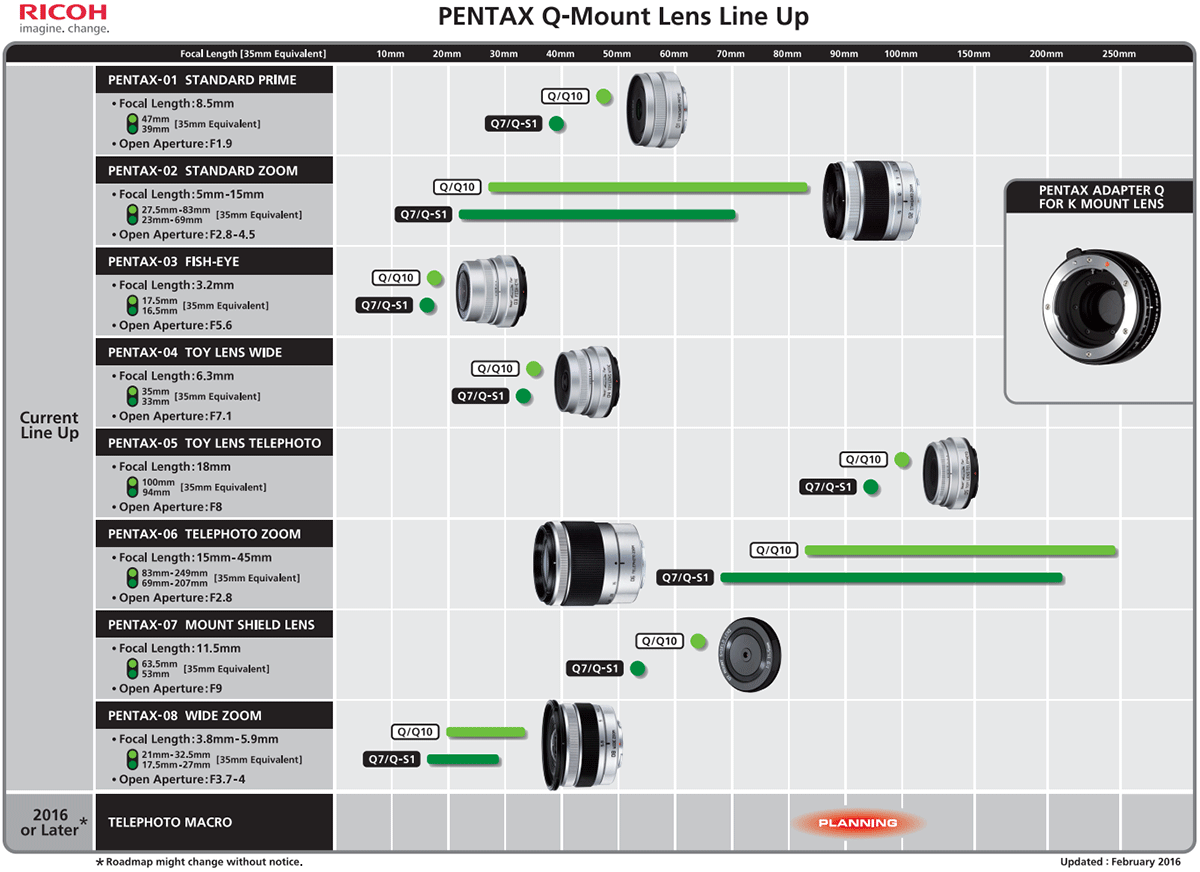 Here is the full set of five new and updated Pentax K, 645 and Q lens roadmaps for 2016: