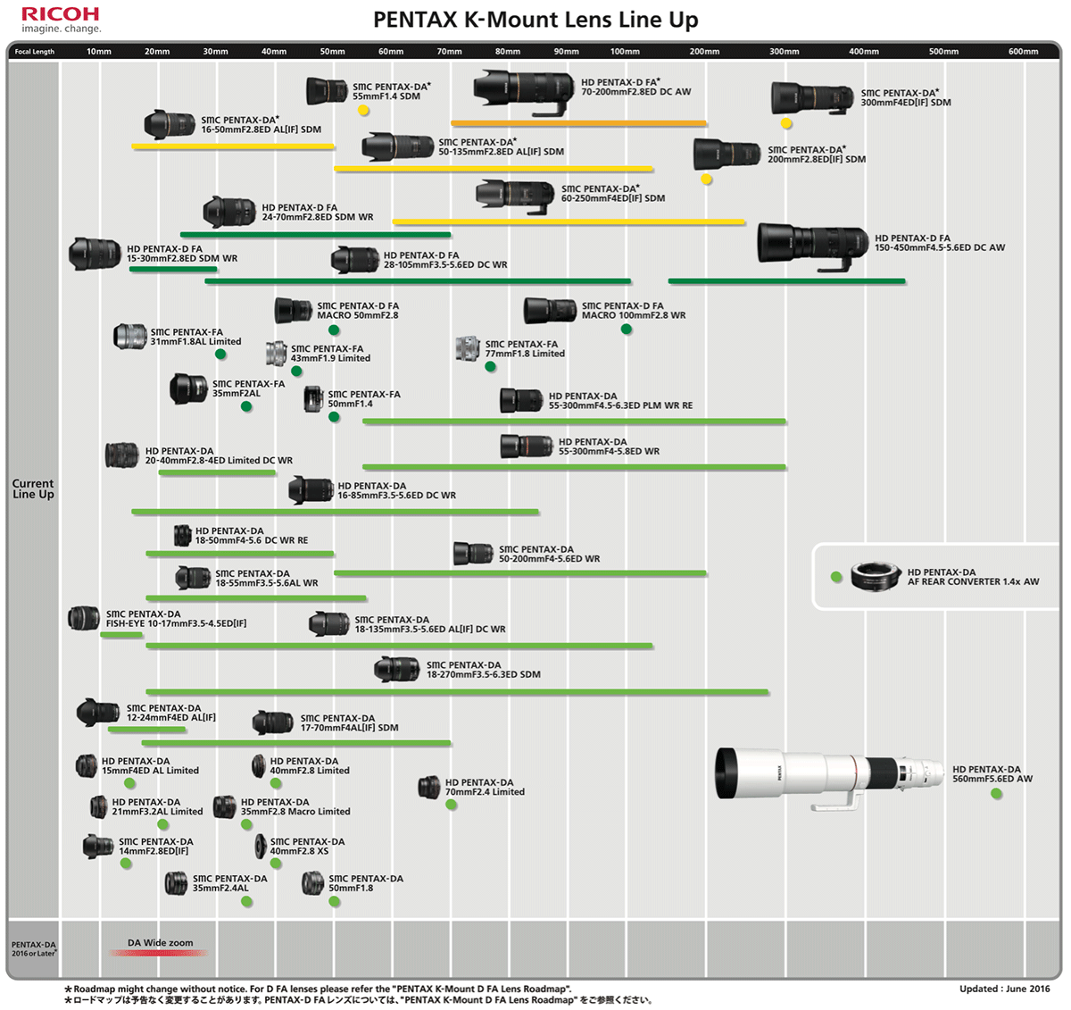 Ricoh published an updated Pentax K-mount lens roadmap as of June, 2016 (posted above) – the only difference I can find when comparing to the previous version is the addition of a HD Pentax-DA 55-300mm f/4.5-6.3 ED PLM WR RE lens: