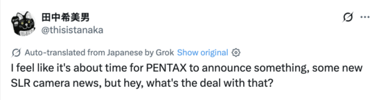 The Japanese photographer Kimio Tanaka, who has been a good source of Ricoh/Pentax insider information in the past, recently hinted on X that Pentax may announce a new SLR camera soon: