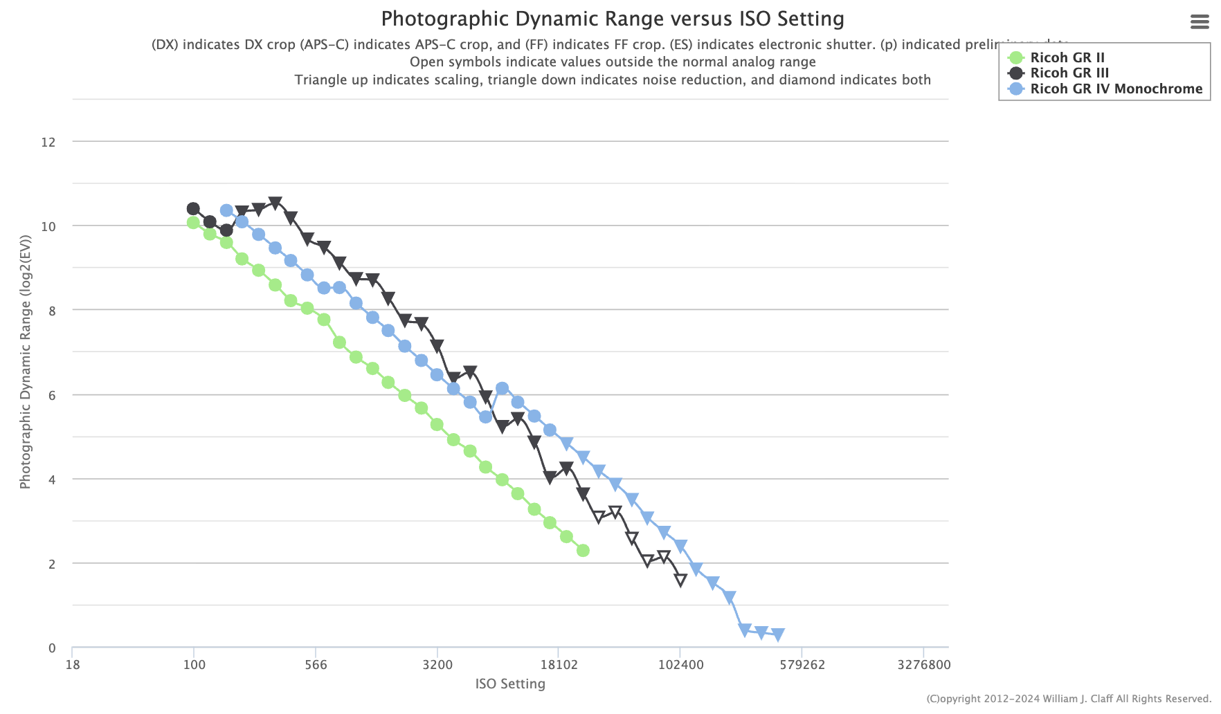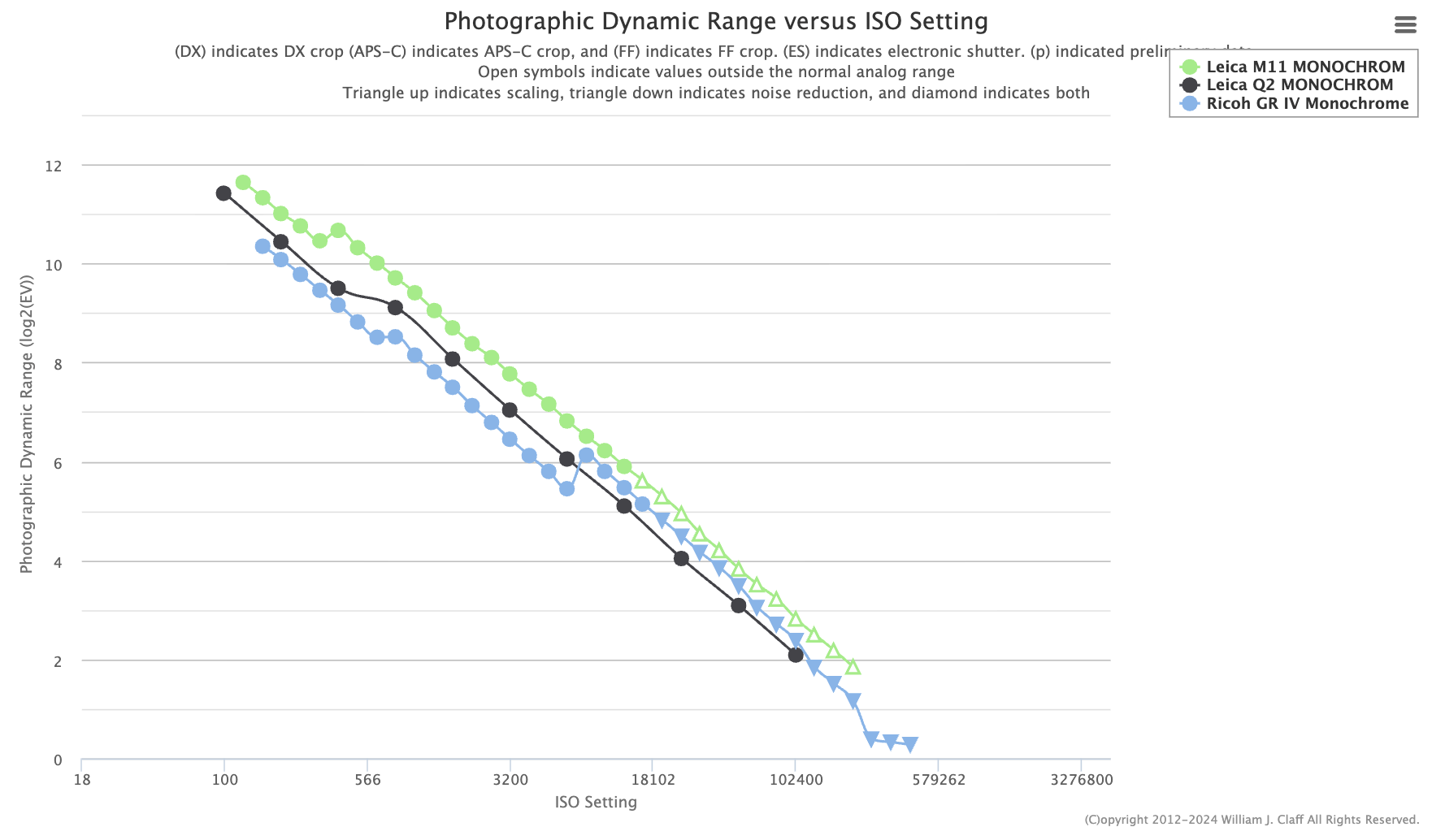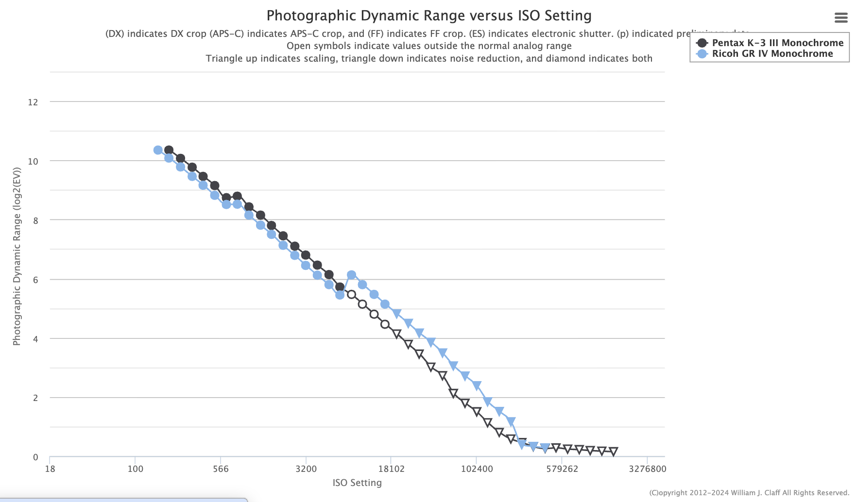 Photons to Photos published their photographic dynamic range and other sensor measurements for the Ricoh GR IV Monochrome camera. Here are some comparisons with other GR, Pentax, and Leica camera models: