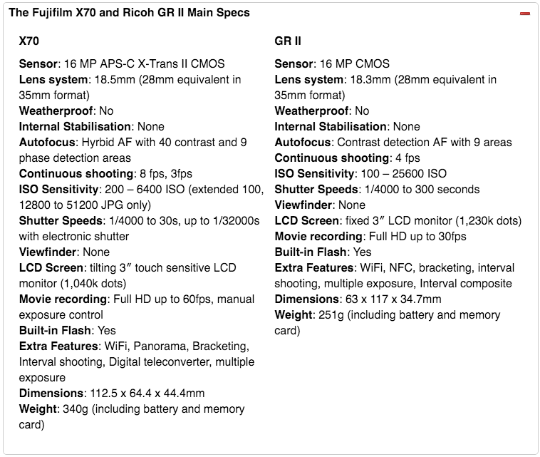 Mirrorlessons posted a comparison between the Fujifilm X70 ($699) and Ricoh GR II ($591) 28mm premium compact cameras: