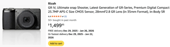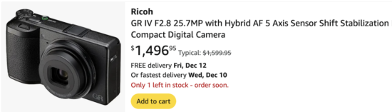 The Ricoh GR IV camera is now in stock at Amazon from an authorized dealer at the regular MSRP:
