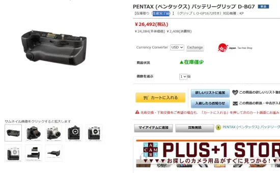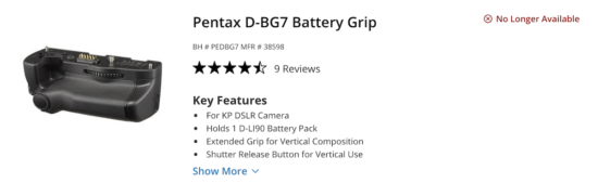 The Pentax D-BG7 battery grip for the Pentax KP DSLR camera is marked as discontinued at several stores (more discontinued Pentax/Ricoh products can be found here):