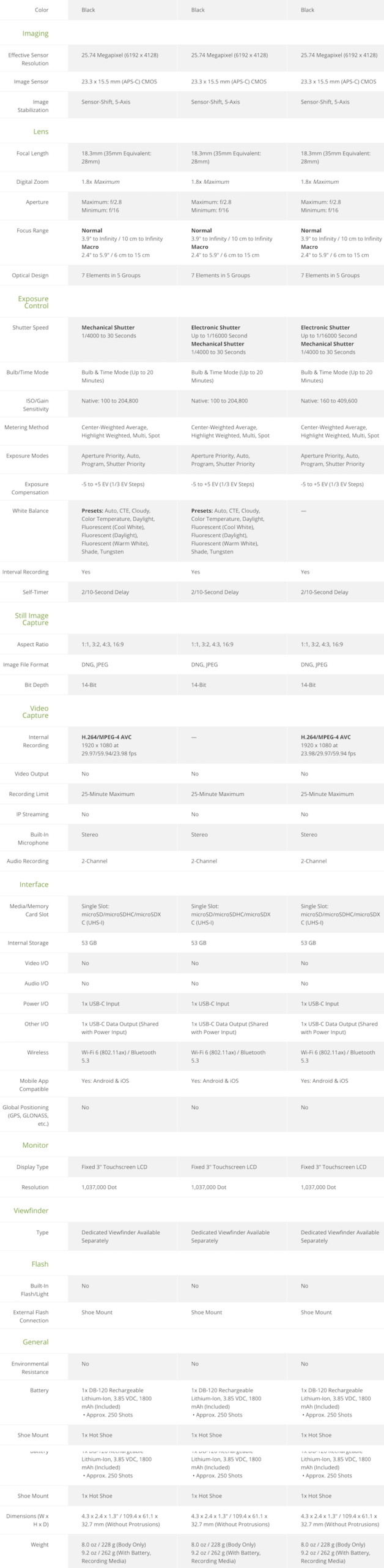 Sensor 25.74MP APS-C BSI CMOS (Color) 25.74MP APS-C BSI CMOS (Color) 25.74MP APS-C BSI CMOS (Monochrome, no color filter array)