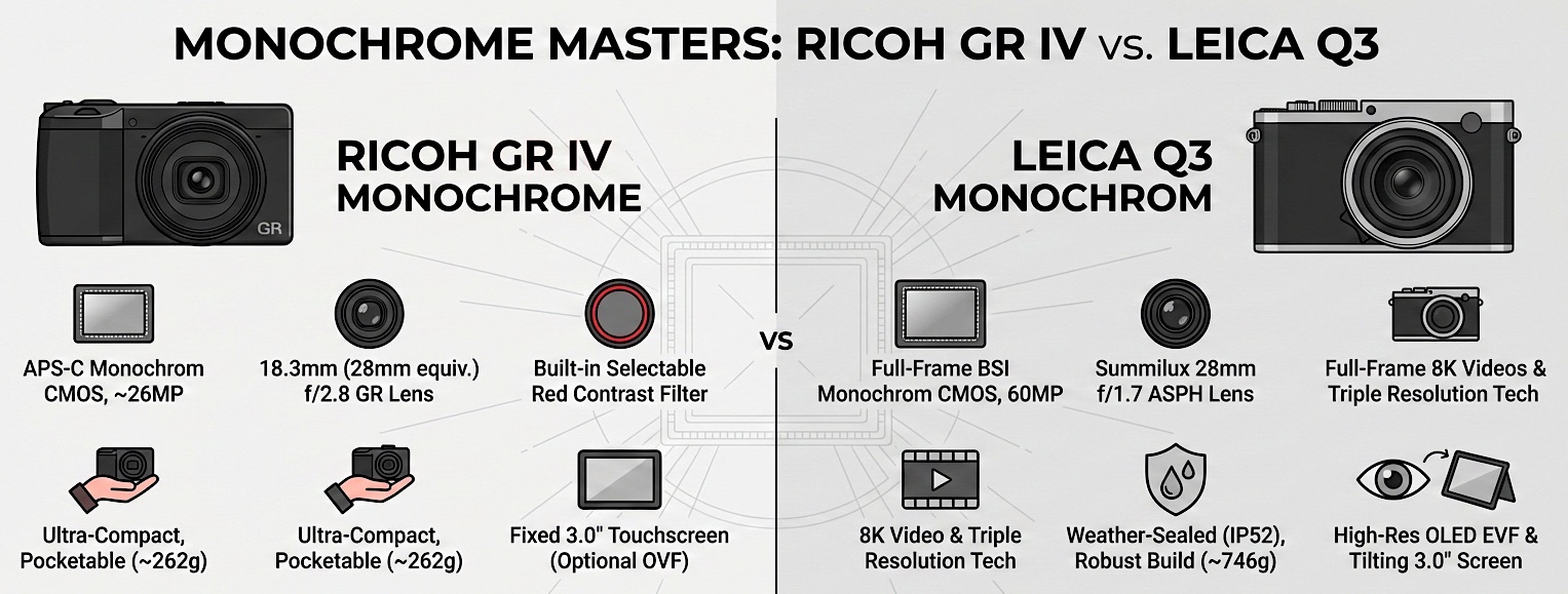A specifications comparison between the Ricoh GR IV Monochrome and Leica Q3 Monochrom can be found here: